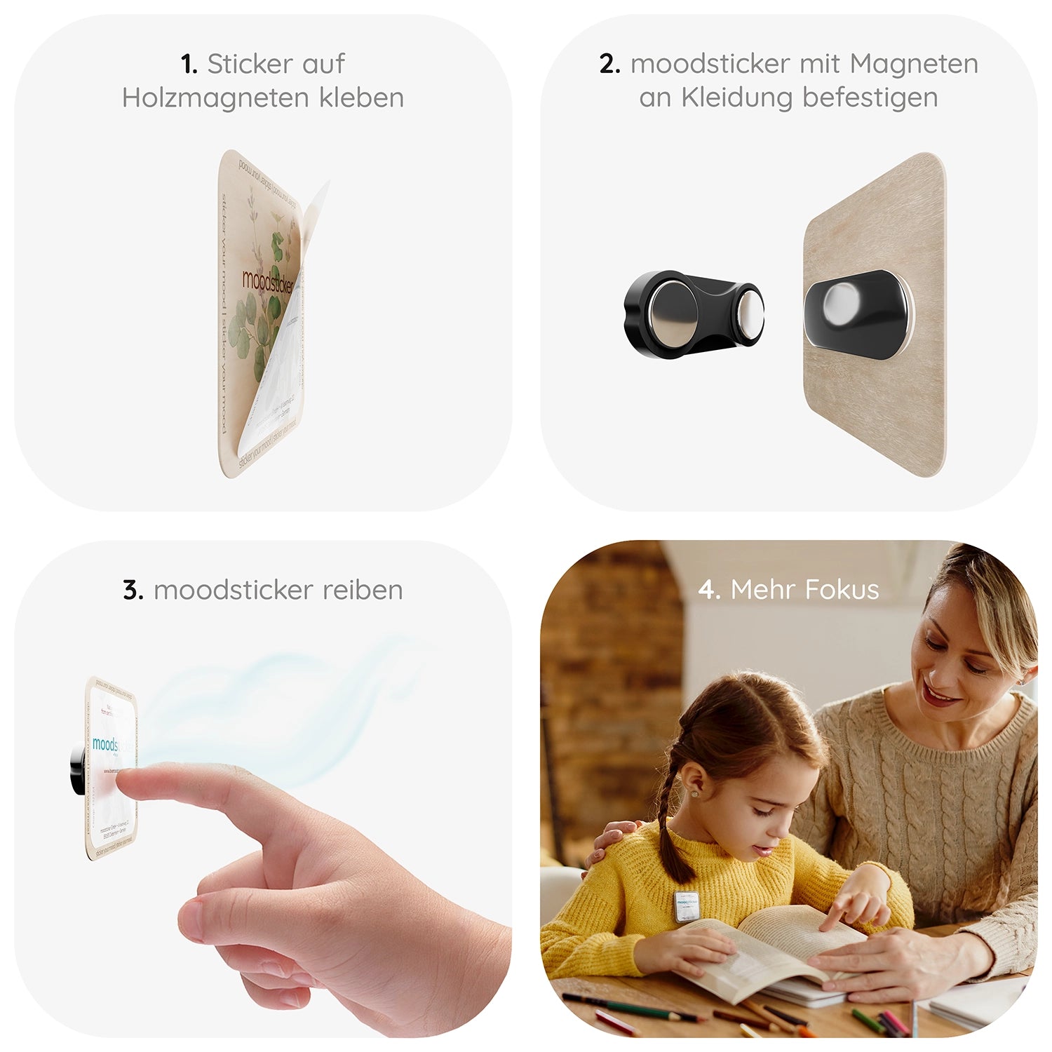 Die Duftsticker mit 100 % Bio-Ölen (Lavendel, Zitrone, Rosmarin) werden mit einem praktischen Magnethalter an der Kleidung befestigt.